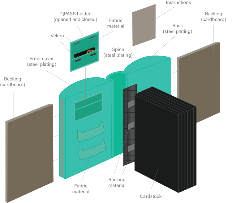 Some features we wanted to include: A QPASS holder, printed shelves, and hidden messages on the pages that would be revealed with our app.